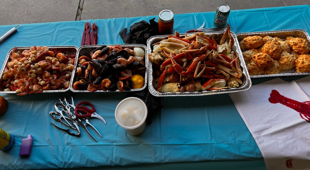 A post-Saturday Nigh Special podcast feast. It was a group effort, but special kudos to the Vice-Prez. Crab boil! Crab (of course), mussels , shrimp, potatoes, corn, scallops, crawdads and biscuits. We ate like royalty cheaper than a local restaurants and better tasting. Hopefully it will be Time For Another crab boil soon!